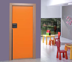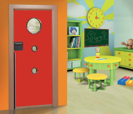 Todas las puertas Pivotan especiales para colegios y guarderías se preparan con caucho protector anti-pinzamientos en el cierre y con manivela de seguridad, con melamina de color y vidriera cuadrada superior opcionales.